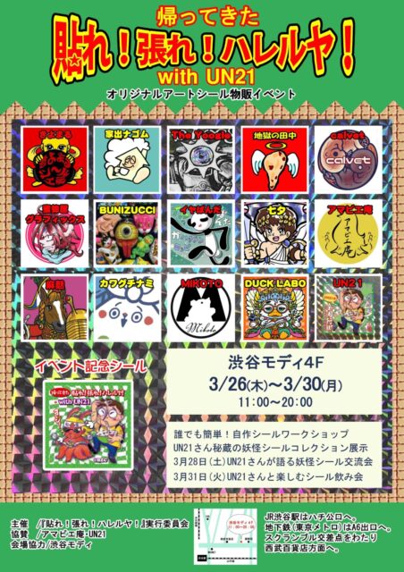 渋谷モディ4Fで開催される帰ってきた貼れ!張れ!ハレルヤ!wiht UN21は、オリジナルアートシールの物販を中心としたイベントです。