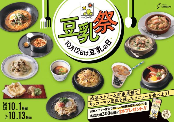 毎年話題の“豆乳の日”を記念して、渋谷ストリームで「キッコーマン豆乳『豆乳祭』」が開催!キッコーマン豆乳を使ったオリジナルメニューが全11店舗に登場し、豆乳の魅力とおいしさを再発見できるグルメフェアです。クリーミーなパスタやスイーツ、カフェドリンクなど、豆乳の新しい楽しみ方を体験できるラインナップ。対象メニューを注文すると「おいしい無調整豆乳200ml」を1本プレゼント(各店先着制)という嬉しい特典も!
