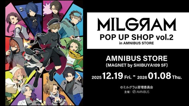 アメコミ風の描き下ろしイラストをテーマにした新作グッズが多数先行販売されるミルグラムの期間限定ポップアップストアです。会場では購入特典の配布やBOX購入者向けの特典企画が実施され、作品の世界観を楽しめる展示も用意されています。混雑緩和のため抽選入場が行われる日程が設けられ、ファン必見の内容が盛り込まれたイベントとなっています。